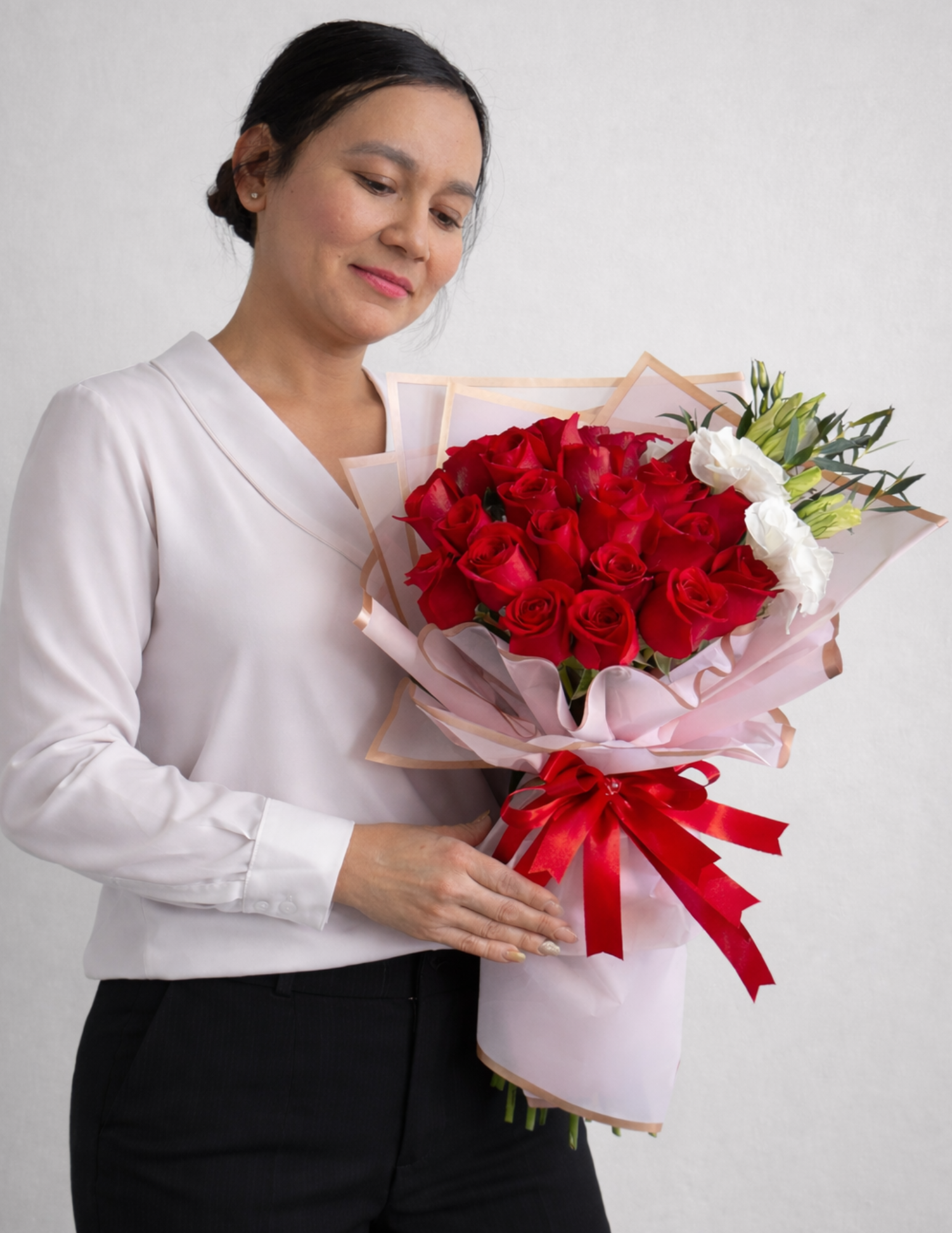 Carlota es un hermoso ramo de 24 rosas rojas con un fino toque de lisianthus, que aporta frescura y delicadeza al diseño. Representa un amor elegante y sincero, ideal para sorprender con buen gusto en este San Valentín.